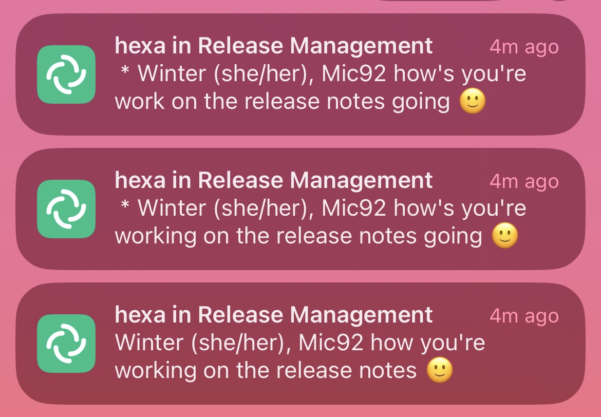 hexa | Winter (she/her), Mic92 how you're working on the release notes 🙂 | 16:01:37 |